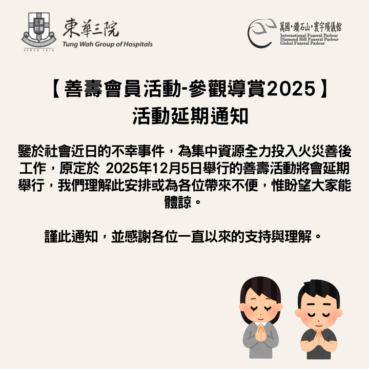 萬國、鑽石山及寰宇殯儀館將於7月4日至6日參與「50+博覽2025」。 展覽上將會有最新的殯儀資訊講座,讓大家認識更多東華三院的殯儀服務。凡現場追蹤殯儀館IG,可換取零食禮品乙份。另外,場內更會有專人協助公衆登記成為善壽會員,現有及新會員均可領取精美紀念品乙份,及獲得拍攝「即影即有」的機會。 歡迎大...