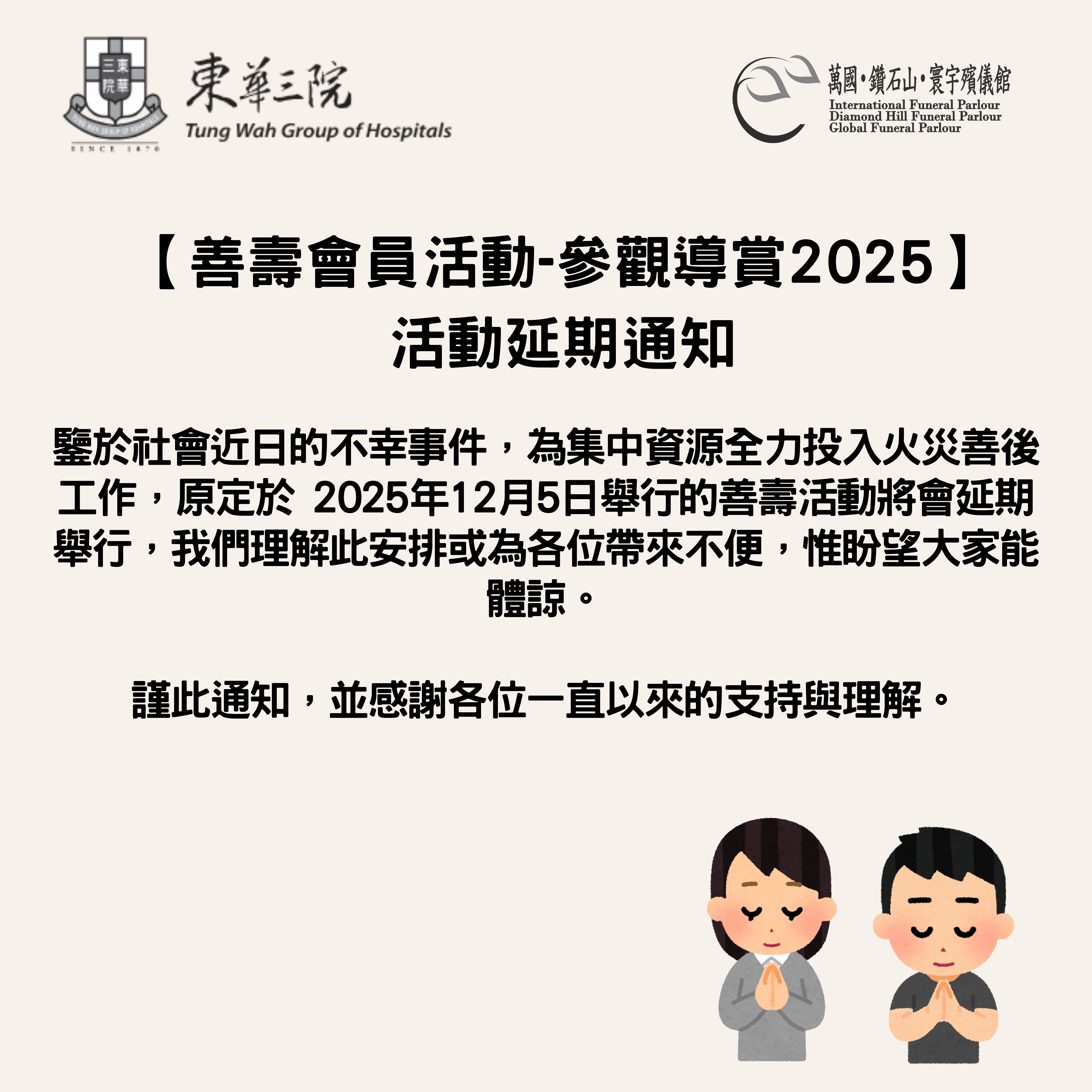 鑒於社會近日的不幸事件,為集中資源全力投入火災善後工作,原定於 2025年12月5日舉行的善壽活動將會延期舉行,我們理解此安排或為各位帶來不便,惟盼望大家能體諒。